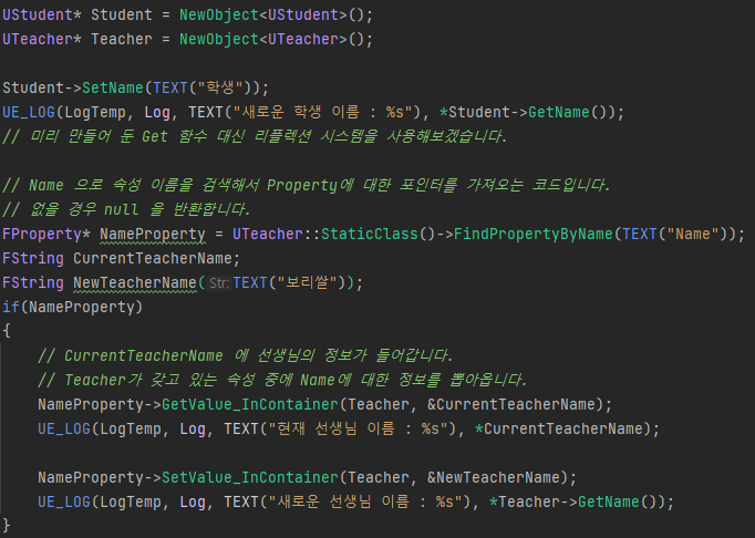 Student의 이름은 Get 함수를 사용해 가져왔지만, Teacher 의 이름은 리플렉션 시스템을 사용해 가져왔습니다.