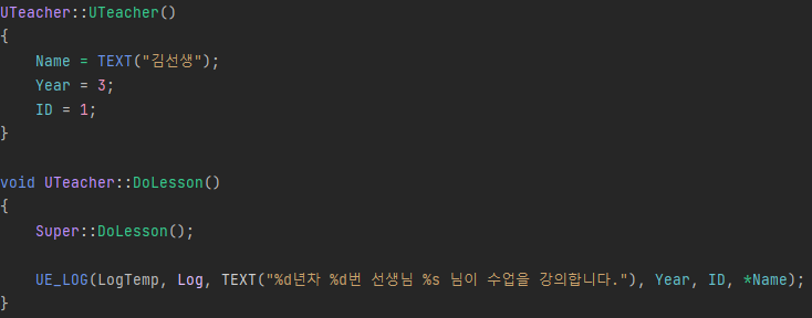 이후에 MyGameInstance.cpp에서 본문을 작성할 때 Student와 Teacher 가 가진 정보들을 변경해보고 DoLesson 함수를 실행해보겠습니다.