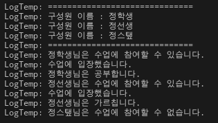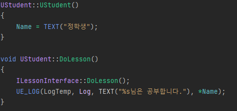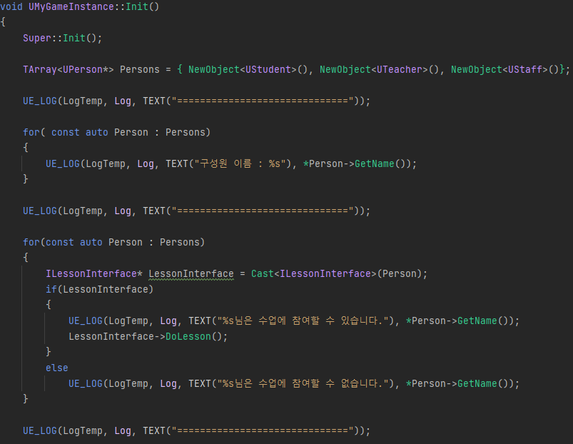 각 구성원들의 이름을 확인하고, 해당 구성원들이 ILessonInterface 클래스를 상속받는지 Cast 를 사용해 타입 형변환이 가능한지 체크하고 nullptr을 반환하면 그에 맞는 분기를 실행합니다.