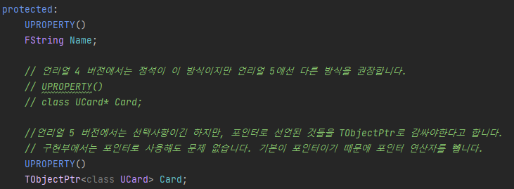 Person 클래스의 멤버 변수 코드입니다. TObjectPtr 을 사용해 클래스 포인터를 감싸주어 변수를 선업합니다.