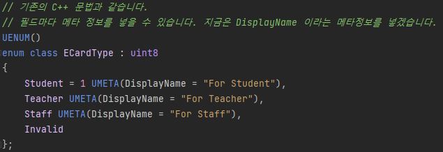 4. 언리얼 C++ 이 제공하는 확장 열거형을 사용해 다양한 메타 정보를 넣고 활용할 수 있습니다.
