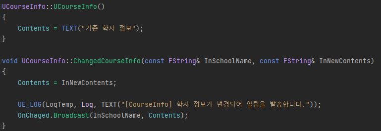 언리얼 델리게이트를 선언한 후에는 학사정보와 학생 정보를 엮습니다. 그렇게 되면 학사 정보가 변경될 때 마다 구독한 학생에게 자동으로 전달됩니다.