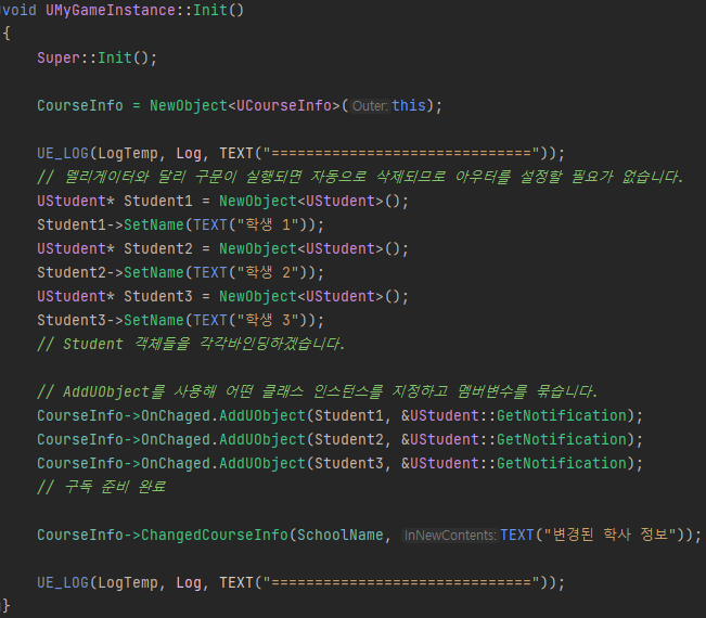 - 학사 정보에서 선언한 델리게이트를 중심으로 구독과 알림을 컨트롤하는 주체를 설정합니다. (연결과 활동의 주체는 GameInstance)